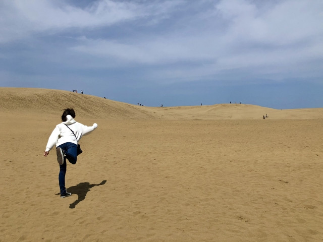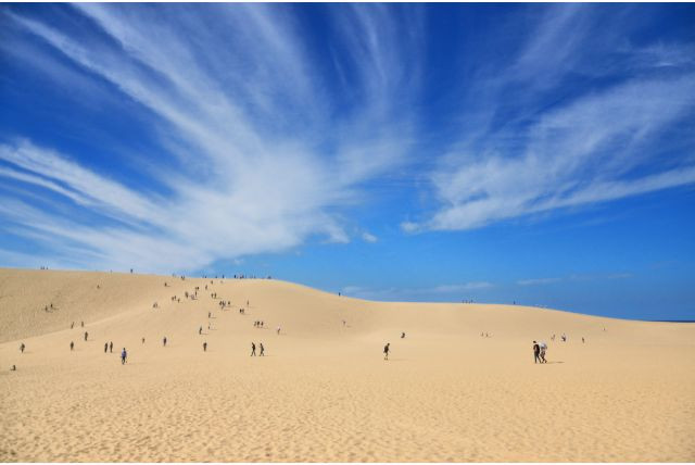 소개를 빼놓으면 아쉬운, 돗토리 사구. 산인해안국립공원(山陰海岸国立公園) 내에 자리한 해안 사구로, 천연기념물로 지정되어 있습니다. 내륙 쪽에서 사구 너머는 바로 바다. 사막과 같은 느낌이 드는 한 편 지척의 바닷바람이 느껴지지는 않을까?