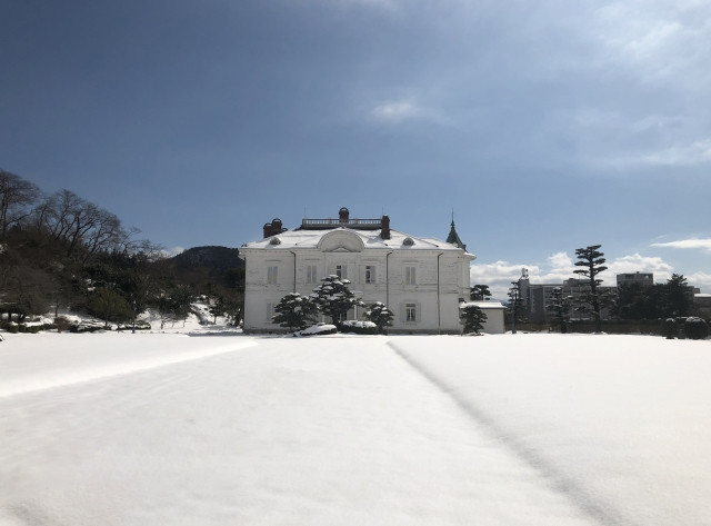 돗토리번의 번주인 이케다(池田) 가문의 별장 저택으로 1907년(메이지 40년)에 지금 위치에 지어졌습니다. 사진은 흰 눈이 내렸을 때지만 벚꽃이 필 때 벚꽃 나무 너머로 보이는 단아한 흰색 건물도 무척 아름답습니다.