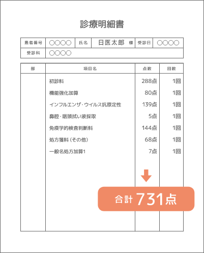 위의 진료비 명세서는 점수가 합계 731점으로 7310엔이 되지만, 자기부담금은 30%에 해당되기 때문에 2,190엔이 됩니다.