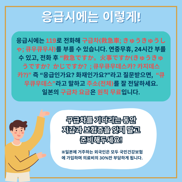 일본 생활 중에 몸이 아프면 병원에 가야 하는데, 병원비는 어느 정도 내게 될까? 혹시 큰 병원을 이용해야 할 때는 어떤 절차를 거쳐야 할까? 이번 기사에서는 일본에서 아플 때 당황하지 않고 병원을 이용할 수 있도록 필요한 기본 지식을 소개드립니다. 응급시에 구급차를 이용하기 위한 지식, 고액의 병원비를 지불해야 할 때 이용할 수 있는 좋은 제도에 대해서도 소개드리니 꼭 참고해보세요!