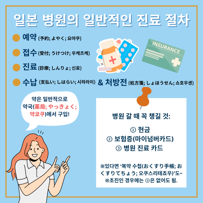 일본에서 병원에 갈 때 필요한 것, 절차는 한국의 병원 갈 때와 비슷합니다. 일본어가 부족해 걱정된다면 챙겨야 할 준비물, 순서를 살펴두고, 관련된 일본어를 공부해두세요. <알아두면 든든한 병원 일본어: 증상, 통증, 병명 등 일본어 표현을 상황별 예문, 도움되는 일본 의료 정보와 함께 해설>의 기사 내용이 참고가 될 것입니다.