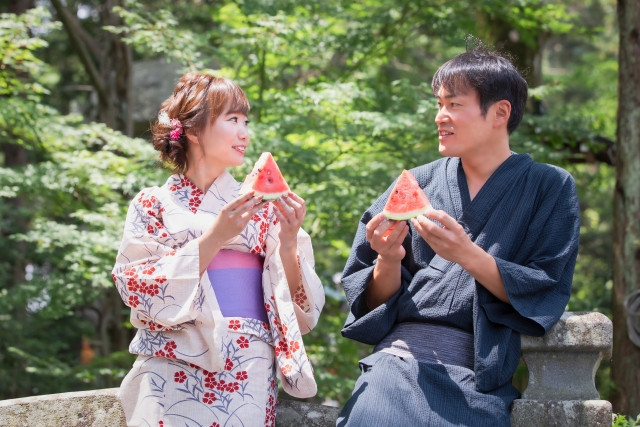 유카타란 여름에 착용하는 얇은 옷입니다. 옛날에는 목욕 후에 ‘헤야기(部屋着; 실내복)’, ‘네마키(寝巻き; 잠옷)’으로 입었고, 현재는 하나비 대회(불꽃놀이)나 여름 마츠리에 자주 입습니다.