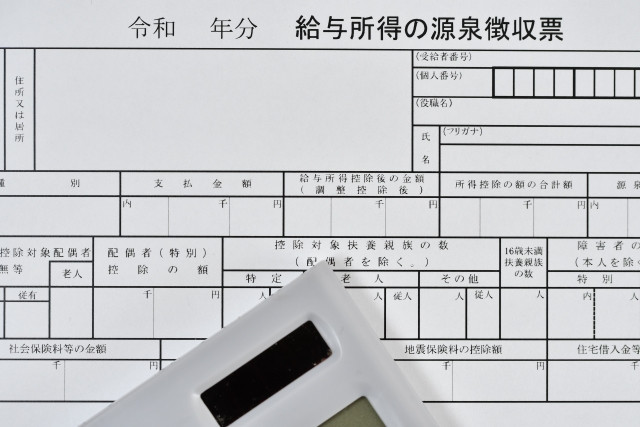 ’원천징수표’는 해당 년도에 회사로부터 지급받은 급여 등 합계와, 거기서 공제된 소득세 등의 금액이 기재되어 있는 표입니다. 서류에는 '給与所得の源泉徴収票(큐요쇼토쿠노 겐센쵸슈효)'라는 명칭이 붙어 있습니다.