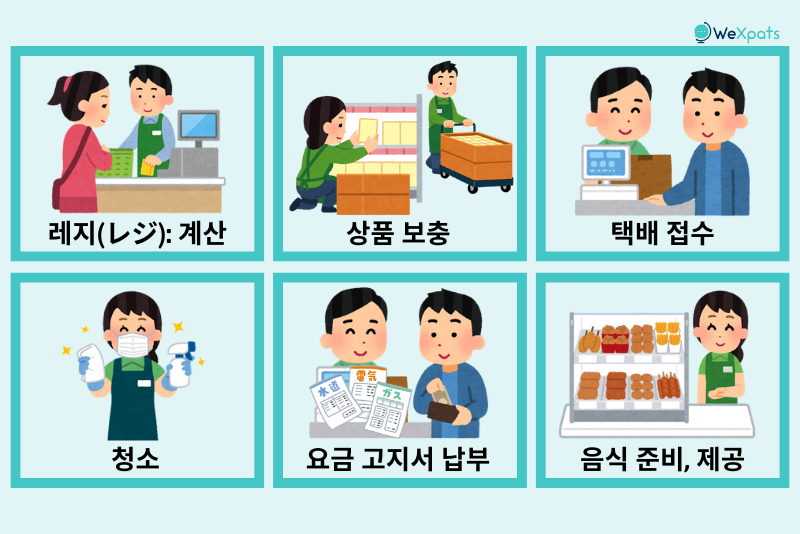 편의점에서 아르바이트를 할 때의 업무 내용은, 주로 ‘레지’, ‘상품 보충’, ‘요금 고지서 납부’, ‘택배 접수’, ‘청소’, ‘접객’ 등으로 나눌 수 있습니다. 각각의 업무를 조금 더 자세히 살펴볼까요?