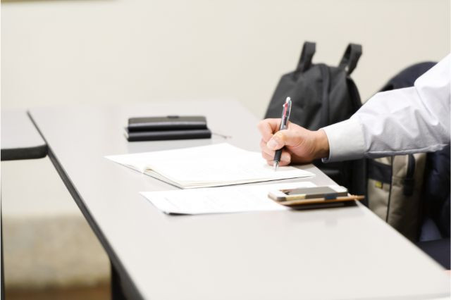 여유 있게 개시 시작 5~10분 정도 전에 자리에 앉아 개시 시작을 기다립니다. 친구와의 잡담은 피하고, 배부된 자료를 보면서 조용히 기다립시다. 다리나 팔을 꼬지 않도록 하고, 등을 똑바로 펴고 앉읍시다. 일본에서는 앉은 자세나 태도 등으로 매너와 예의범절을 확인하는 경우가 많다는 점을 생각하고 주의해야 합니다.