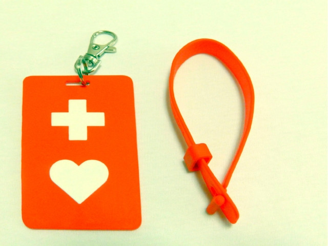 ヘルプマーク/의족이나 인공관절을 사용하고 있는 사람, 내부 장애나 난치병 환자, 임신 초기의 임신부 등 겉으로는 알 수 없어도 도움이나 배려를 필요로하는 이들이 주위의 배려가 필요하다고 쉽게 알릴 수 있도록 도쿄도에서 작성한 마크. 가방 등에 달 수 있는 빨간색 카드 형태로 십자 모양과 하트 모양이 세로로 표시되어 있음.