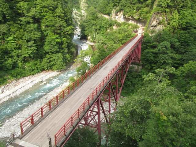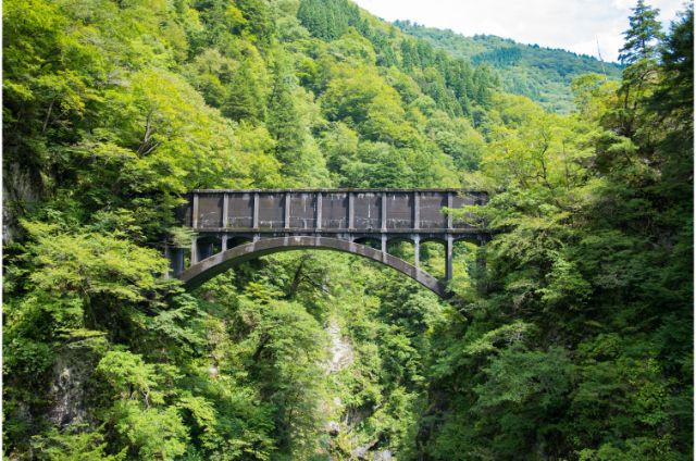 높이 60미터, 길이 64미터. 협곡 중에서 가장 험준한 계곡에 걸린 푸른 다리입니다. 쿠로나기역에서 5분 정도 걸어가면 나오는 쿠로나기 유보도(黒薙遊歩道) 쪽이 아토비키바시를 촬영하기에는 최적의 장소라고~