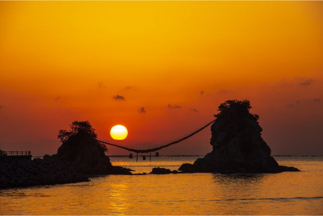 시메나와(しめ縄)라고 하는 신사에서 신성한 장소를 표기하기 위해 사용하는 굵은 밧줄로 두 바위가 이어져 있는데, 이 바위는 ‘부부 바위(夫婦岩)’라고 합니다. 시메나와의 길이 65미터, 무게는 자그마치 2톤.