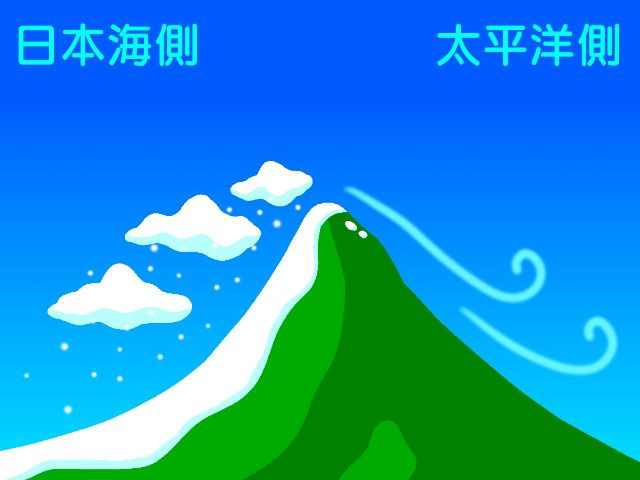 바다에서 불어오는 계절풍은 습기를 많이 머금고 있어 비나 눈이 많이 내리게 됩니다. 그런데 일본 열도에서는 ‘산맥’들의 영향을 받게 됩니다. 일본 열도의 산맥 위치에 따르면 일본해 쪽에서 습기를 머금은 바람이 불어와도 표고가 높은 산맥이 버티고 서 있어 넘지 못하게 되는 것. 일본해와 산맥 사이 지역에서, 습기를 품은 겨울 계절풍이 산맥을 타고 올라가다가 기온이 낮아져 비나 눈이 되어 내리는 것입니다.