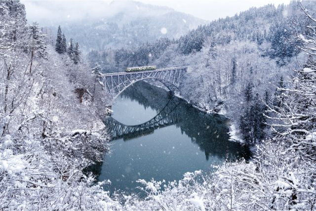 이와테현과 함께 태평양측 지역 중 호설지대로 지정되어 있는 후쿠시마현에서 아름다운 눈풍경을 자아내는 제1타다미가와 교량. 앞에서 일본해측 기후에 영향을 미치는 산맥 중 ‘오우산맥’이 후쿠시마현에도 뻗어 있어 일부 지역이 겨울에 눈이 많이 내리는 ‘일본해측 기후’를 보입니다. 제1타다미가와 교량이 위치한 오누마군(大沼郡)은 산맥 기준으로 일본해측에 가깝고, 호설지대로 지정되어 있습니다.