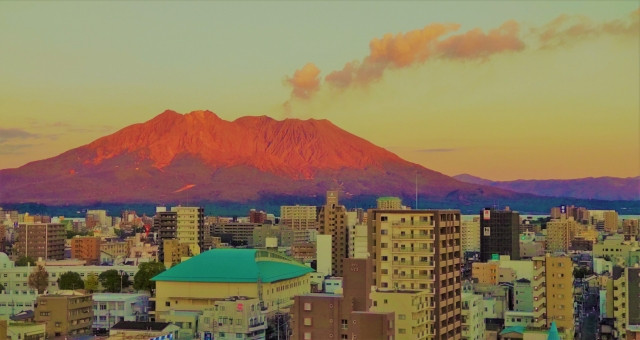 가고시마하면 떠오르는 명소, ‘사쿠라지마(桜島)’ 화산이죠. 분화구에서 연기가 피어오르는 모습이 강렬합니다. 바다를 끼고 60만 인구가 살고 있는 시가지까지 4km미터, 페리로 15분 거리가 떨어져 있을 뿐이라 가까이에서 화산을 보기 위해 관광객들도 많이 찾고 있습니다.