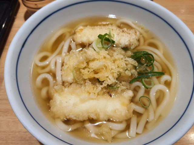 제가 주문한 메뉴는 오징어 튀김인 ‘이카텐(イカ天)’이 든 우동. 사진에서도 살짝 느껴지지만 정말 면이 부드러웠습니다. 탱글탱글한 면의 우동을 좋아하시는 분들이라면 예상 밖일 식감이지만, 저는 평소 그 탱글탱글함이 조금 부담스럽게 느껴질 때가 있었거든요(싫어하는 것은 아니었지만요). 아침으로 먹기에는 부드러운 후쿠오카 스타일의 우동이 무척 편안하고 맛있게 느껴졌습니다.
