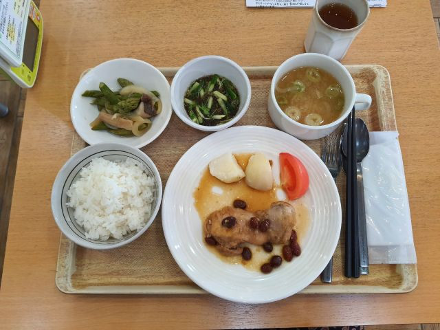 타니타 식당에서는 그날그날의 히가와리 메뉴 외에 주간 단위로 바뀌는 ‘슈가와리(週替わり)’ 메뉴도 한 가지씩, 매일 두 가지 메뉴가 일반적으로 제공되는데, 저는 히가와리 메뉴였던 ‘닭고기와 건포도의 적포도주 조림 정식(鶏肉とレーズンの赤ワイン煮定食)’을 골랐습니다.
