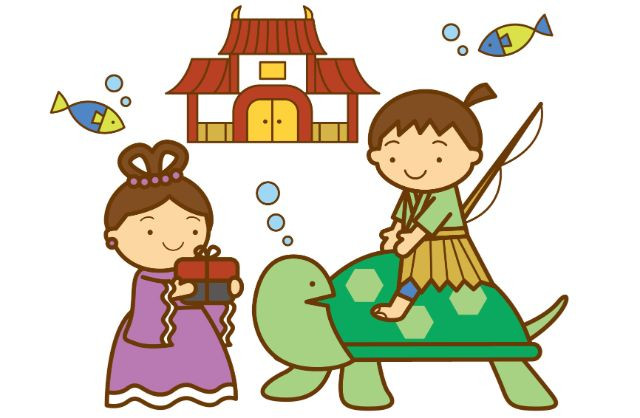괴롭힘을 당하는 가메(亀; かめ), 즉 ‘거북이’를 도와준 우라시마타로(浦島太郎; うらしまたろう). 보답으로 용궁성에 초대받아 며칠간 즐겁게 보냅니다. 그러다 마을에 두고 온 어머니 생각에 돌아가고 싶다고 이야기를 합니다. 용궁성의 오토히메사마(乙姫様; おとひめさま), 즉 용왕님의 따님은 우라시마타로에게 다마테바코(玉手箱; たまてばこ)를 건네며 “이 상자는 절대로 열면 안 된다”고 합니다. 마을로 돌아간 우라시마타로는 주변 풍경이 전과 달라진 것에서 용궁성에서 지내는 동안 300년이나 세월이 흘렀다는 것을 알게 됩니다. 오토히메사마의 충고를 잊고 다마테바코를 열어버린 우라시마타로는 안에서 나온 연기에 휩싸여 할아버지 모습으로 변해버립니다.