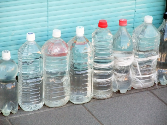 관찰력 좋은 외국인들이라면 일본 생활 초기에 발견하고 궁금해할 이것. 셔터가 내려간 가게 앞에 나란히 물이 담겨 놓여 있는 페트병들. 왜 이렇게 해두었을까? 궁금해집니다.