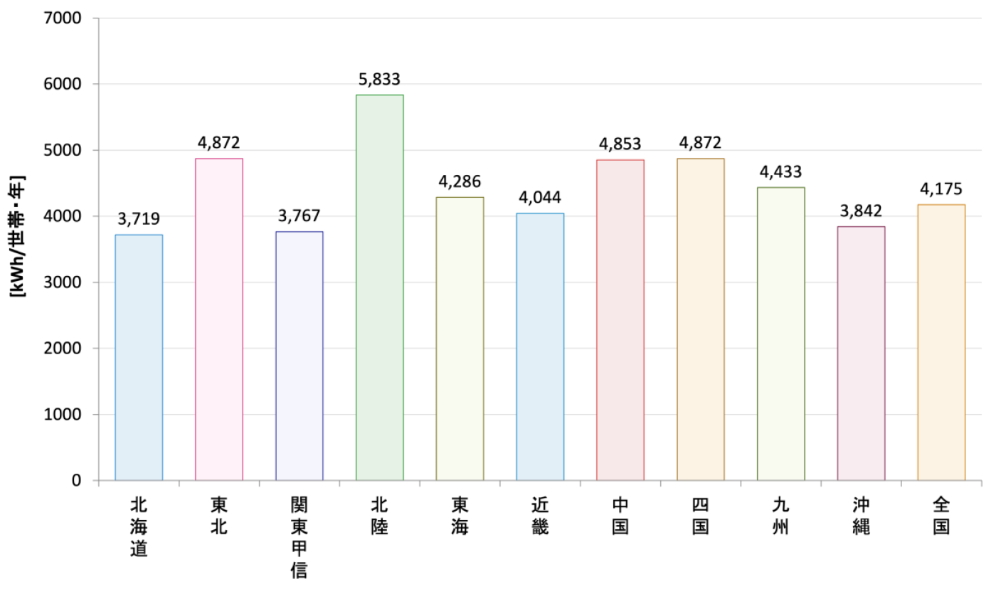 *인용: 環境省(환경성) <地方別世帯当たり年間電気消費量(固有単位)>