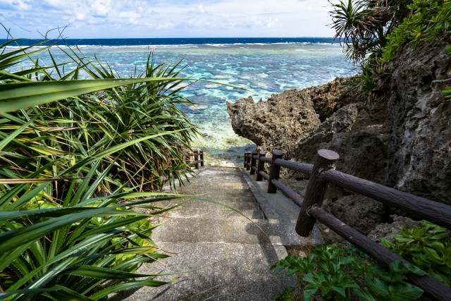 앞에서 미야코지마에서 다리로 연결된 세 섬 중 하나로 잠깐 소개한 섬입니다. 깨끗한 바다를 즐길 수 있는 관광 명소가 많지만, 북부에 위치한 ‘후나우사기바나타(フナウサギバナタ)’[이라부지마 방언으로 ‘배를 배웅하는 곶’이라는 뜻]라는 독특한 이름의 전망대와 그곳에서 바다로 이어지는 계단인 ‘신비지(シンビジ)’가 특히 유명합니다.