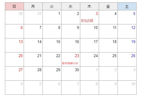 2024년 11월의 축일은, 3일의 ‘문화의 날(文化の日; ぶんかのひ)’과 23일의 ‘노동 감사의 날(勤労感謝の日; ろうどうかんしゃのひ)’입니다.