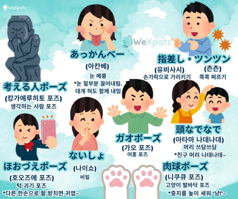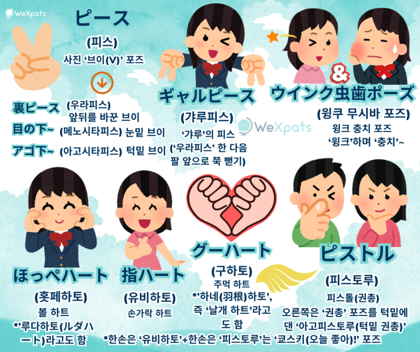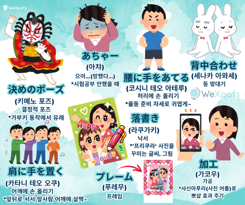 하토(하트), 피스(브이), 홋페(뺨), 나카요시(사이 좋게)... 귀여운 프리쿠라 포즈를 찾아보고 배워두려면 일본어 공부가 필수~ 다양한 프리쿠라 포즈들을 살펴보며 일본어 공부를 해볼까요? 일본어 표현을 인터넷에 검색하면 다양한 프리쿠라 사진을 구경할 수 있습니다.