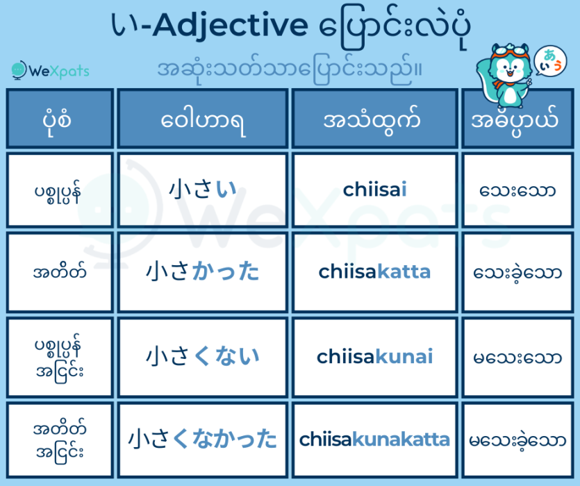 အောက်မှာတော့ い-adjectives တွေကိုဘယ်လိုပုံစံပြောင်းရမလဲ ဆိုတာ ကိုဖော်ပြထားတဲ့ဇယားဖြစ်ပါတယ်၊ အသေးစိတ်ကိုတော့ N5 Adjectives ဇယား - JLPTအတွက်ပြင်ဆင်ကြရအောင်။ မှာဝင်ရောက်ဖတ်ရှုနိုင်ပါတယ်။