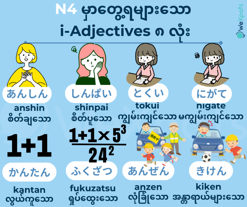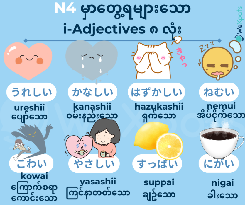 အခြေခံ N5 Level အတွက် i-adjectives နဲ့ na-adjectives တွေနဲ့ အတူပုံစံပြောင်းနည်းကိုသေချာသိထားတဲ့သူတွေအတွက် ဒီဆောင်းပါးမှာတော့ N4 Level မှာလိုအပ်တဲ့ adjectives တွေကိုဖော်ပြပေးသွားပါ့မယ်။