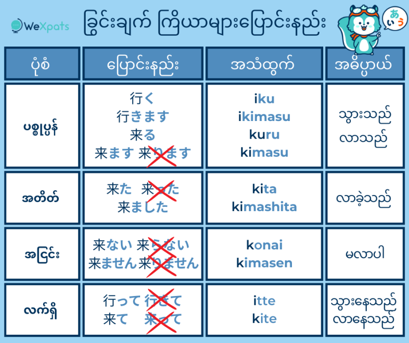 する (suru) တစ်လုံးတည်းဆိုရင် ပြုလုပ်တယ်ဆိုတဲ့ အဓိပွာယ် ရပါတယ်။ သူ့အနောက်မှာ နာမ်တစ်ခုခု ပေါင်းထည့်ပြီး ကြိယာတွေ ကိုဖန်တီးနိုင်ပါတယ်။ ဥပမာ 電話 (denwa) ဆိုတာ ကတော့ တယ်လီဖုန်း ဖြစ်ပြီး 電話する (denwasuru) ဆိုတာကတော့ ဖုန်းဆက်တယ်ဆိုတဲ့ အဓိပွာယ်ရပါတယ်။する動詞 (suru-doushi)တွေကို ပုံစံပြောင်းတာကတော့ တော်တော် လွယ်ကူပါတယ်။ အသေးစိတ်ကို အောက်ပါဇယားကနေ ကြည့်ရှုနိုင်ပါတယ်။နောက်ထပ် ပူံမှန်မဟုတ်တဲ့ ခြွင်းချက် ကြိယာကတော့ 来る (kuru) လာသည် ဆိုတဲ့ ကြိယာ နှင့် 行く(iku)လာသည်ဆိုတဲ့ ကြိယာ ဖြစ်ပါတယ်။ ဒီခြွင်းချက်ကြိယာတွေကို ပြောင်းပုံပြောင်းနည်း တွေကို အောက်ပါဇယားမှာဖော်ပြလိုက်ပါတယ်။