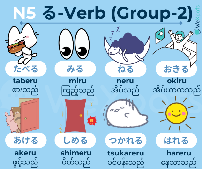 る動詞 (ru-doushi) သို့မဟုတ် Ru-verbs တွေကတော့ る နဲ့ဆုံးသတ်တဲ့ ကြိယာတွေ ဖြစ်ပါတယ်။ ဥပမာ わたしはパンを食べる (watashi wa pan wo taberu) ပေါင်မုန့်ကိုစားသည်။ る動詞 (ru-doushi) သို့မဟုတ် Ru-verbs တွေကတော့ Group 2 လို့ခွဲခြားလေ့လဲရှိကြပါတယ်။ る動詞 (ru-doushi) တွေကတော့ အများအားဖြင့် Conjugate လုပ်ရလဲ လွယ်ကူပါတယ်။ る動詞 (ru-doushi) တွေကို Conjugate လုပ်တဲ့အခါမှာ る နေရာမှာ အစားထိုးလိုက်ရုံပဲ ဖြစ်ပါတယ်။