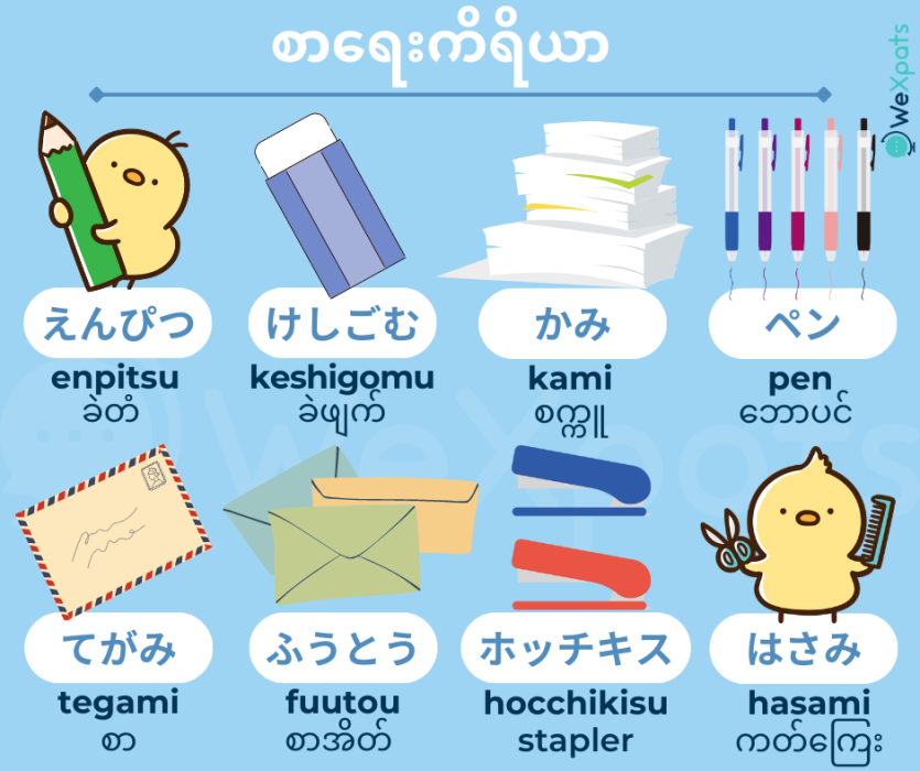 စာရေးကိရိယာတွေကတော့ စာလေ့လာနဲ့အချိန်မှာ မဖြစ်မနေ လိုအပ်တဲ့အရာတွေဖြစ်ပါတယ်။ စာရေးကိရိယာကိုတော့ ဂျပန်လို 筆記用具 (hikki-yougu) လို့ခေါ်ပါတယ်။