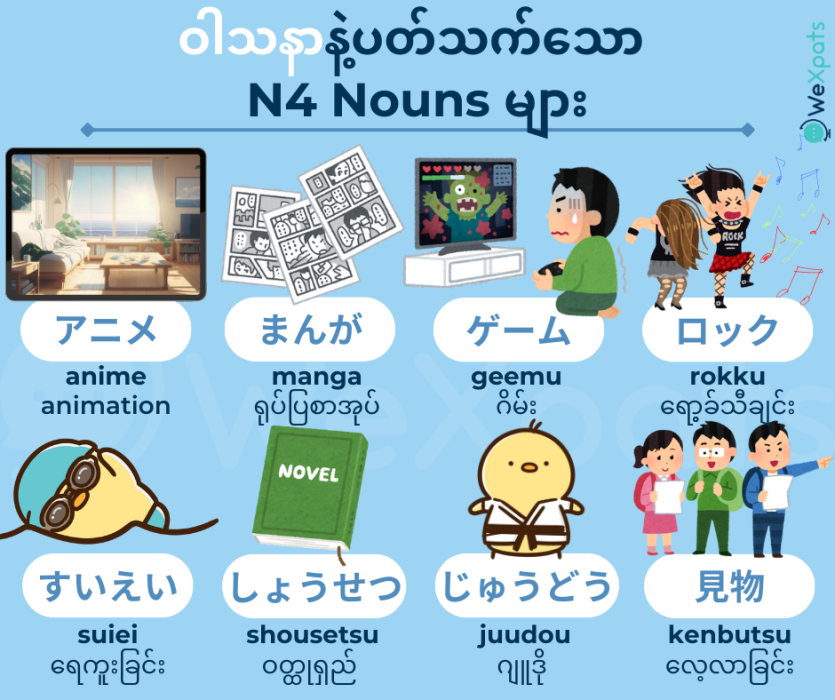 ဒီဆောင်းပါးမှာတော့ N4 Level မှာတွေ့ရတဲ့ နာမ် ၉၉ လုံးကိုဖော်ပြသွားမှာ ဖြသ်ပါတယ်။ ဒီနာမ်တွေ ကတော့