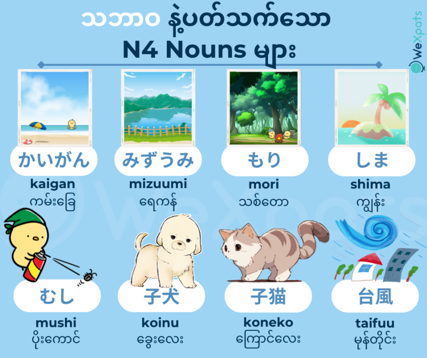 N4 Level မှာတော့ သဘာဝဘေးအန္တာရာယ် တွေနဲ့ ပတ်သက်တဲ့ အခြေခံ စကားလုံးတွေကို လေ့လာရမှာ ဖြစ်ပါတယ်။ အနက်ရောက်စကားလုံးတွေနဲ့ ရေးထားတဲ့ ခန်းဂျိတွေကိုတော့ ကျက်မှတ်ထားဖို့လိုအပ်ပါတယ်။