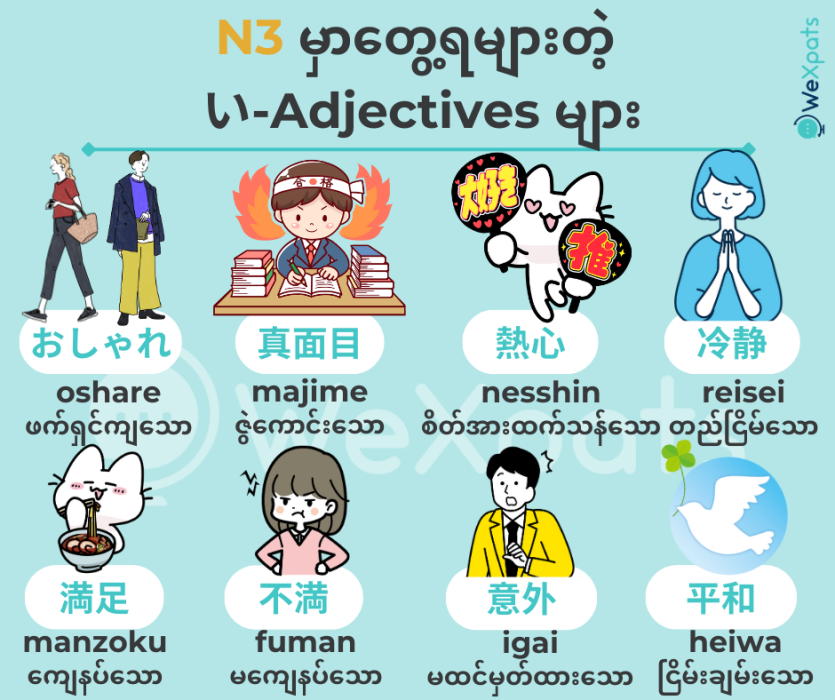 ဂျပန်စာကို ပိုလေ့လာလေ Adjectives တွေပိုများလာလေဖြစ်ပြီး အဲဒီလေ့လာထားတဲ့ Adjectives တွေနဲ့ အကြောင်းအရာတွေကိုပိုပြီးအသေးစိတ်ပြောပြလာနိုင်လေ့ဖြစ်ပါတယ်။ ဒီနေ့မှာတော့ JLPT N3 မှာတွေ့ရတဲ့ Adjectives အလုံး ၈၀ ကို ဖော်ပြသွားမှာဖြစ်ပါတယ်။
