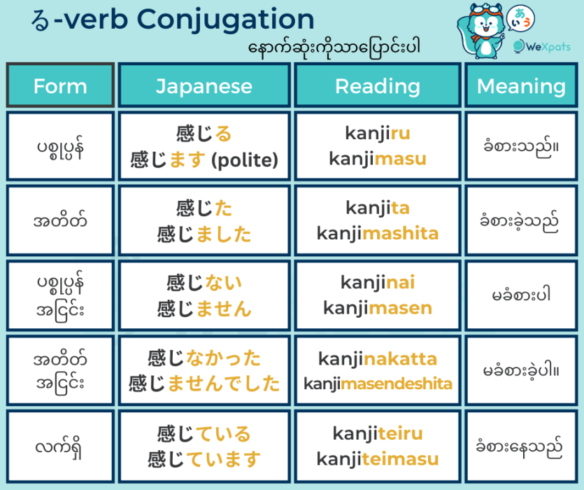 る動詞 (ru-doushi) Ru - Verb များ။る (ru) နဲ့အဆုံးသတ်၊။ ဥပမာ - “感じる (kanjiru) - ခံစားသည်။