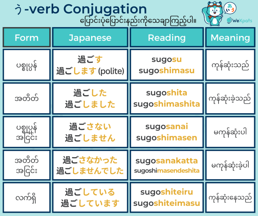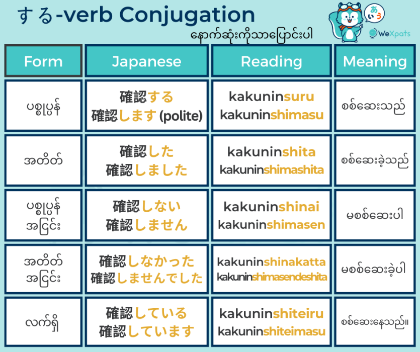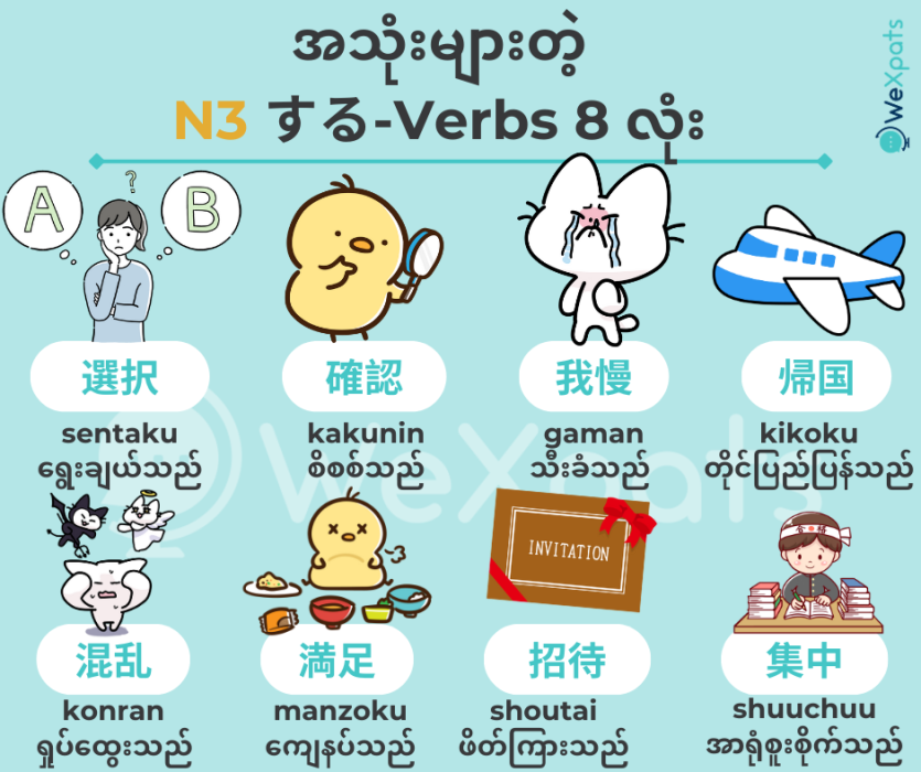 する動詞 (suru-doushi) Suru Verb။ Noun - する ပုံစံတွေများပြား။ ဥပမာ -“帰国する (kikokusuru)