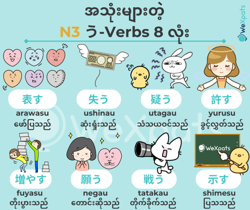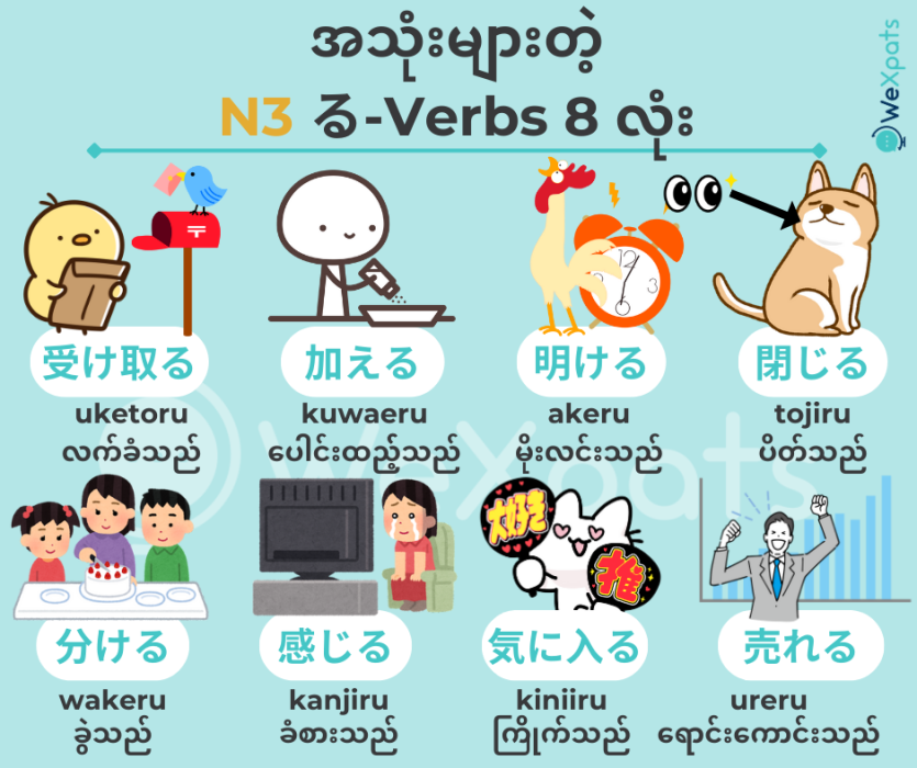 N3 မှာတော့ အဓိပ္ပာယ် ခပ်ဆင်ဆင် Verbs တွေအများကြီးရှိပါတယ်။ N3 က Verbsတွေမှာတော့ conjugated လုပ်ရတာကလဲ တော်တော်အရေးကြီးတဲ့အတွက်ကြောင့်မို့လို့ conjugated forms တွေကိုလဲသေချာမှတ်သားဖို့အရေးကြီးပြီး ဥပမာစာကြောင်းတွေနဲ့ အတူတူတွဲမှတ်ဖို့ကလဲ အရေးကြီးပါတယ်။
