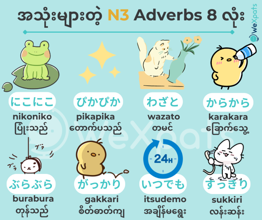 ဒီဆောင်းပါးမှာတော့ N3 မှာပါဝင်တဲ့ ကြိယာဝိသေသန Adverbs တွေအကြောင်းကိုဖော်ပြသွားမှာဖြစ်ပါတယ် ။verbနဲ့ noun တွေနဲ့ယှဥ်လိုက်ရင် Adverb တွေကပိုပြီးတော့ မှတ်ရခက်ခဲပြီး ပိုပြီးတော့ နားလည်ရလဲ ခက်ခဲပါတယ်။ ဒါကြောင့် Adverb တွေပို သေချာနားလည်ဖို့ဆိုရင် ဥပမာစာကြောင်းတွေကိုအထပ်ထပ်ခါခါ ဖတ်ဖို့ လိုအပ်ပါတယ်။ သို့မှသာ စကားလုံးတွေရဲ့ အဓိပွာယ် ကိုပိုပြီးနားလည်မှာ ဖြစ်သလို အသုံးပြုပုံတွေကိုလဲ နားလည်မှာဖြစ်ပါတယ်။ JLPT N3 အတွက်ပြင်ဆင်နေတဲ့ သူတွေအတွက်တော့ ဒီဆောင်းပါးကိုဖတ်ပြီး N3 Adverbsတွေကိုကျွမ်းကျင်ပိုင်နိုင်အောင်လေ့ကျင့်ဖို့ တိုက်တွန်းချင်ပါတယ်။