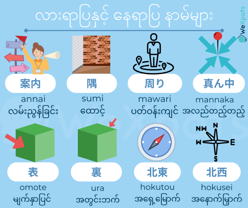 N5 မှာတော့ အရှေ့အနောက်တောင်မြောက်စတဲ့ လားရာဘက်ကို မှတ်ခဲ့ပြီးပြီလို့ထင်ပါတယ်။ ဒါကြောင့် အခုတော့ ပိုပြီးအသေးစိတ်ကျတဲ့ တည်နေရာတွေကိုပြောတဲ့ အချိန်မှာ အသုံးဝင်တဲ့ စကားလုံးတွေကိုမှတ်ကြရအောင်။