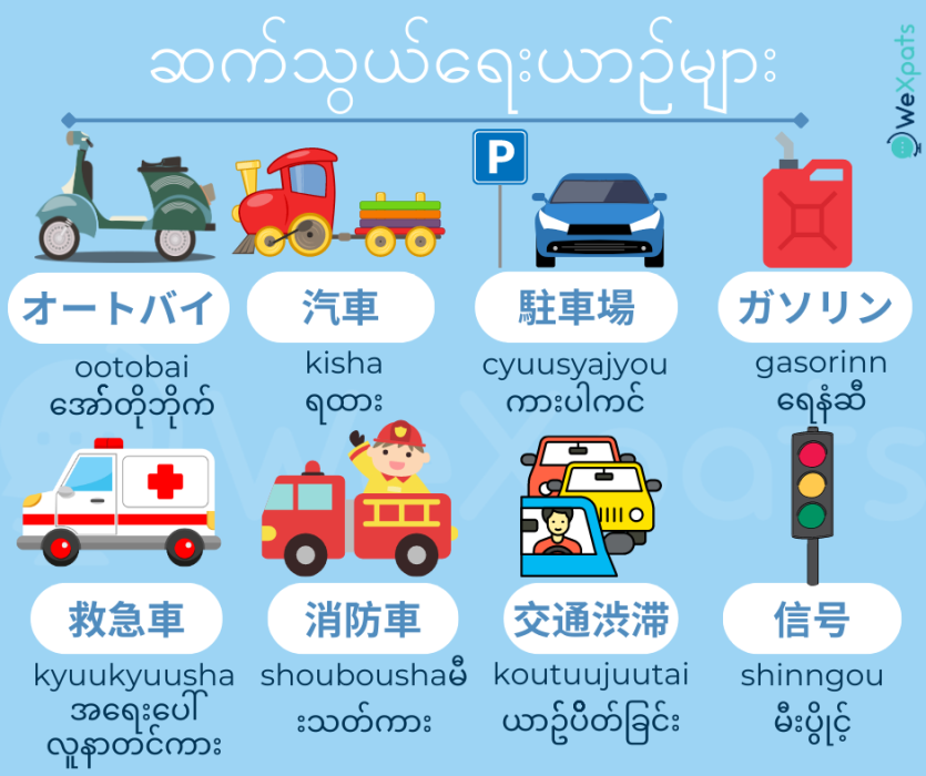 - ဆက်သွယ်ရေးယာဥ်များ - ယာဥ်များနှင့်ဆက်စပ်တဲ့စကားလုံးများ။