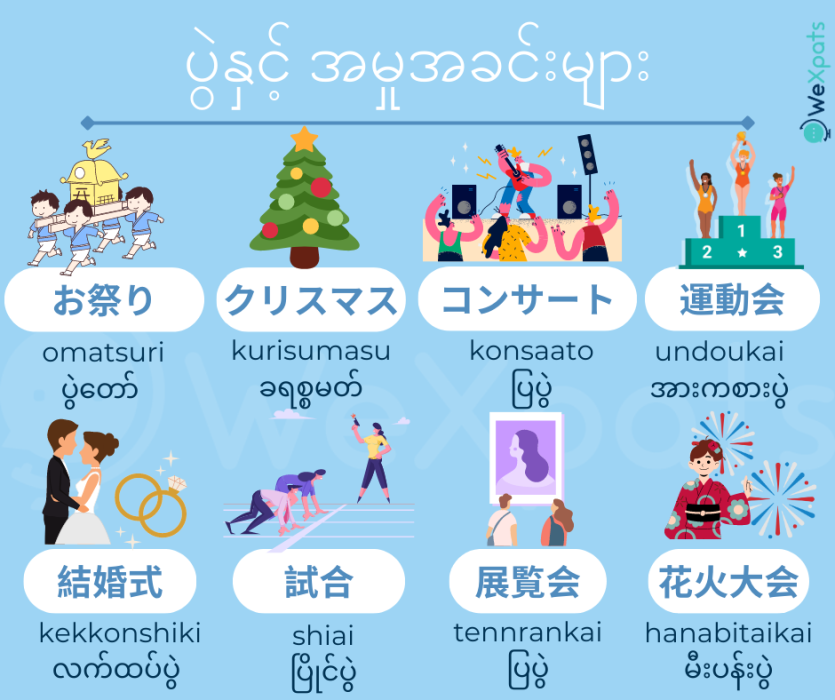 နောက်ဆုံးအနေနဲ့ ပွဲတွေအကြောင်းကိုမိတ်ဆက်ပေးသွားပါ့မယ်။ ဂျပန်မှာတော့ ပွဲအကြီးတွေလဲရှိသလို ပွဲအသေးလေးတွေလဲရှိပါတယ်။ နွေရာသီရောက်ရင် (夏祭り; natsumatsuri)နွေရာသီပွဲနှင့် (花火大会; hanabitaikai) မီးပန်းပွဲတွေကိုကျင်းပလေ့ရှိပါတယ်။ ပွဲတွေအကြောင်းအသေးစိတ်ကို အောက်ပါဇယားမှာ ဆက်ပြီးဖော်ပြပါ့မယ်။