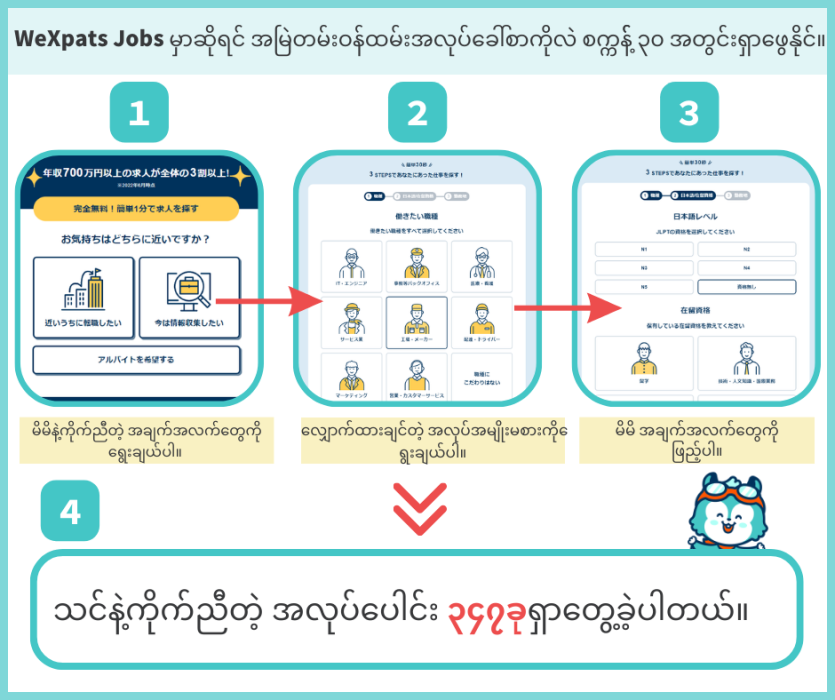 ဂျပန်စာအရည်အချင်း၊ လုပ်ကိုင်ချင်တဲ့အလုပ်အမျိုးအစား၊ အလုပ်နေရာ စတဲ့အရာတွေကိုဖြည့်စွက်ပြီး ကိုယ့်ဘာသာကို ရှာဖွေနိုင်ပါတယ်။