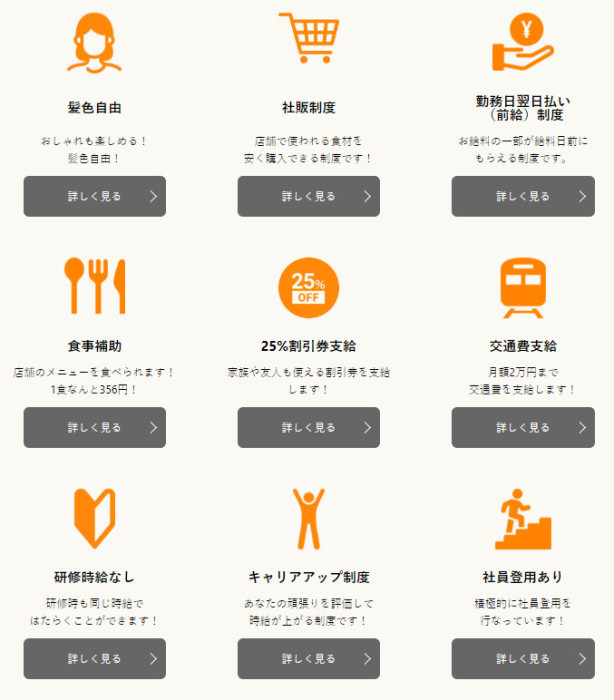 ဒါကြောင့်မို့လို့ အလုပ်လုပ်တဲ့ အချိန်မှာ အခက်အခဲတွေကို နည်းပါးအောင်လုပ်ဆောင်ပေးတဲ့ အပြင် ပိုပြီး ဝန်ဆောင်မှု အရည်အသွေးကို တိုးမြှင့်နိုင်ပါက လစာလဲ တိုးလာနိုင်မယ့် အဆင့်၆ဆင့် စနစ်ကိုလဲ အကောင်အထည်ဖော်လျက်ရှိပါတယ်။ အလုပ်နှင့် ဂျပန်စာကိုမှတ်နေရင်းနဲ့ အနားမှာရှိတဲ့ ဝန်ထမ်းတွေက ကူညီရင်းလေ့ရှိတဲ့ အပြင် နိုင်ငံတူက စီနီယာဝန်ထမ်းတွေကနေပြီးတော့ မိခင်ဘာသာစကားနဲ့ ထရိန်နင်လုပ်ပေးတာမျိုးတွေလဲရှိပါတယ်။