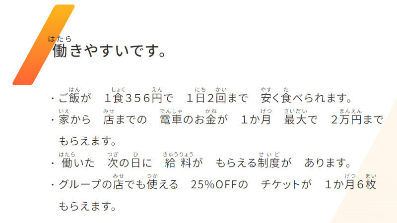 ―― နိုင်ငံခြားသားတွေအတွက် အချိန်ပိုင်းအလုပ်ပေ့ချ်ကိုကြည့်ပြီးတော့ အရမ်းအံ့သြခဲ့ရပါတယ်။အရမ်းဖတ်ရလွယ်တဲ့ ဂျပန်စကားနဲ့ရေးထားတာတွေ့ရပါတယ်။ အလုပ်ခန့်တဲ့အချိန်မှာ အနိမ့်ဆုံးလိုအပ်တဲ့ ဂျပန်စာအရည်အချင်းကဘယ်လောက်ဖြစ်မလဲ။