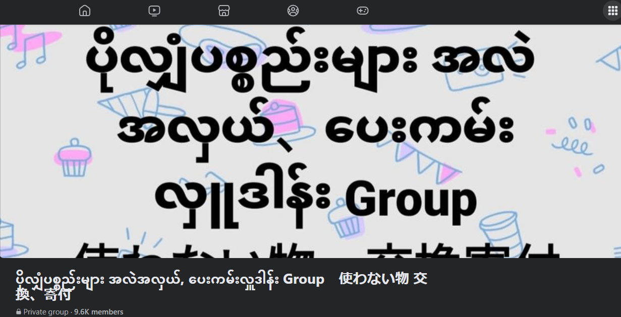 နောက်တစ်နေရာကတော့ ဝန်ဆောင်မှုခတွေ သက်သာတဲ့နေရာလို့ဆိုနိုင်တဲ့ Facebook Group တွေမှာ မလိုအပ်တဲ့ ပစ္စည်းတွေရောင်းချခြင်း၊ ဝယ်ယူခြင်းဖြစ်ပါတယ်။ အထူးသဖြင့် နေရာဒေသအလိုက်တွေ့နိုင်တဲ့ 〇〇 sayonara sale group တွေမှာရောင်း၊ ဝယ်ပြုလုပ်ခြင်းဖြစ်ပါတယ်။ အများအားဖြင့် အင်္ဂလိပ်လိုနဲ့ အရောင်းအဝယ်ပြုလုပ်လေ့ရှိကြပါတယ်။ sayonara sale group တွေမှာတော့မလိုအပ်တဲ့ ပစ္စည်းတွေကို အခမဲ့ ပြန်ပေးတာမျိုးတွေလဲရှိပါတယ်။ သတိထားရမယ့် အချက်ကတော့ အပေါ်က အက်ပလီကေးရှင်းတွေမှာလို သေချာ ပစ္စည်းအကြောင်းအရာတွေကိုသေချာရေးတာတို့ စျေးနှုန်းနှင့် တခြား လိုအပ်ချက် အကြောင်းအရာတွေကိုပါ သေချာဖြည့်စွက်ရေးသာဖို့လိုအပ်ပါတယ်။
