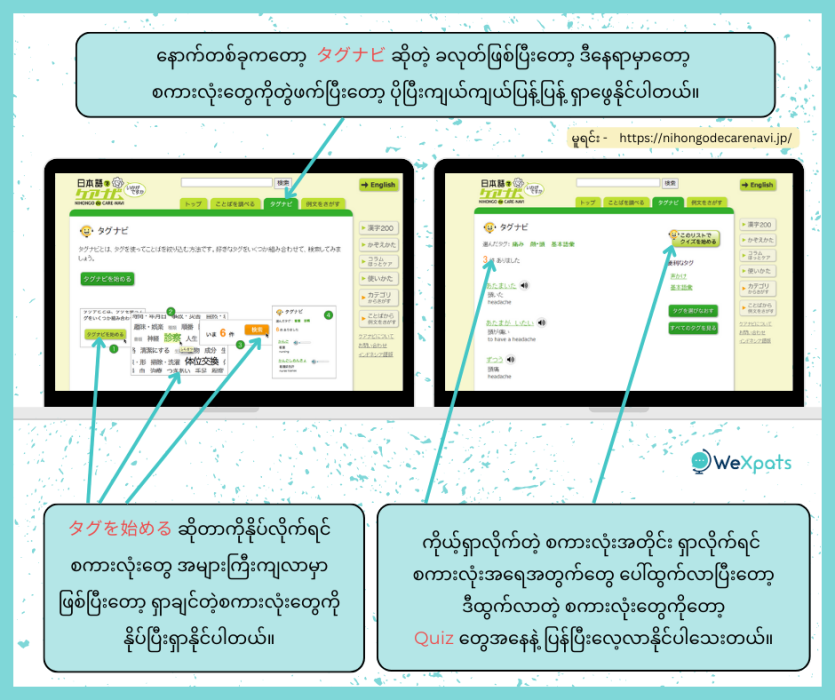 နောက်တစ်ခုကတော့ タグナビ ဆိုတဲ့နေရာဖြစ်ပြီးတော့ ဒီကနေပြီးတော့ စကားလုံးတွေကို တွဲဖက်ပြီးတော့ ပိုပြီးကျယ်ကျယ်ပြန့်ပြန့်ရှာဖွေနိုင်မှာဖြစ်ပါတယ်။ タグを始めるဆိုတာကိုနိုပ်လိုက်ရင်စကားလုံးတွေအများကြီးကျလာမှာဖြစ်ပြီးတော့ရှာချင်တဲ့စကားလုံးတွေကိုနိုပ်ပြီးရှာနိုင်ပါတယ်။နောက်ပြီးတော့ ကိုယ့်ရှာလိုက်တဲ့ စကားလုံးအတိုင်း ရှာလိုက်ရင်စကားလုံးအရေအတွက်တွေ ပေါ်ထွက်လာပြီးတော့ဒီထွက်လာတဲ့ စကားလုံးတွေကိုတော့Quiz တွေအနေနဲ့ ပြန်ပြီးလေ့လာနိုင်ပါသေးတယ်။