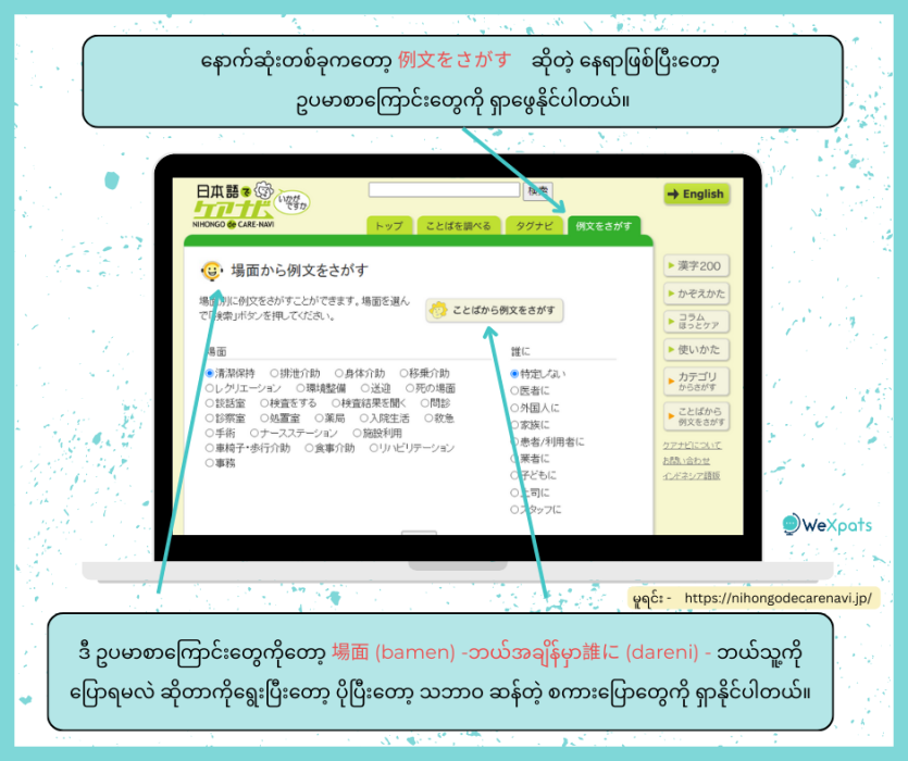 နောက်ဆုံးတစ်ခုကတော့ 例文をさがす ဆိုတဲ့ နေရာဖြစ်ပြီးတော့ဥပမာစာကြောင်းတွေကို ရှာဖွေနိုင်ပါတယ်။ဒီ ဥပမာစာကြောင်းတွေကိုတော့ 場面 (bamen) -ဘယ်အချိန်မှာ誰に (dareni) - ဘယ်သူ့ကိုပြောရမလဲ ဆိုတာကိုရွေးပြီးတော့ ပိုပြီးတော့ သဘာဝ ဆန်တဲ့ စကားပြောတွေကို ရှာနိုင်ပါတယ်။