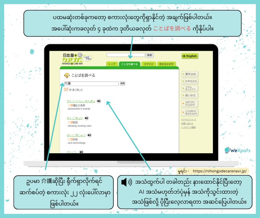 ပထမဆုံး တစ်ခုကတော့ ことばを調べる - စကားလုံးတွေကိုရှာဖွေခြင်း။ ဖြစ်ပါတယ်။ ဥပမာ 介護ဆိုတဲ့ စကားလုံးကိုရှာကြည့်လိုက်မယ်ဆိုရင်တော့ ဒီစကားလုံးပါဝင်တဲ့ စကားလုံးတွေ စုစုပေါင်း ၂၂ လုံးကိုမြင်ရမှာဖြစ်ပြီးတော့ တစ်ခုချင်းစီကို ဘာသာပြန်စကားလုံးတွေနှင့် လေ့လာနိုင်မှာဖြစ်ပါတယ်။ နောက်ပြီးတော့ အသံထွက်ကလဲ အသံထွက်ကိုလဲ AI နဲ့လုပ်ထားတာမျိုးမဟုတ်ဘဲ လူကနေ ထွက်တဲ့ အသံဖြစ်တဲ့ အတွက်ကြောင့်မိုလို့ ပိုပြီးတော့ သဘာဝ ဆန်ဆန်လေ့လာနိုင်မှာဖြစ်ပါတယ်။