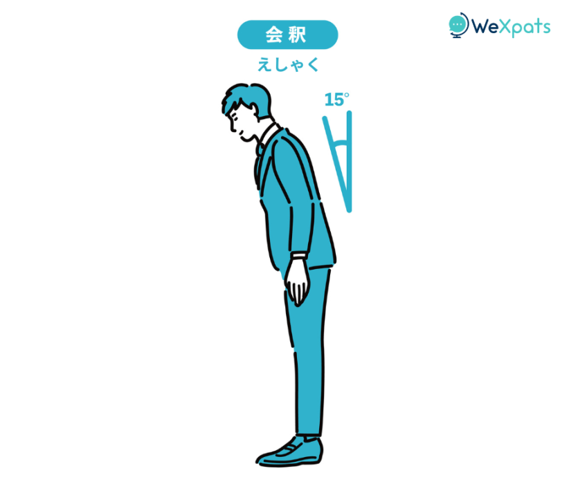 ပထမဆုံးတစ်ခုကတော့ 会釈 (eshaku) အမျိုးအစားဖြစ်ပါတယ်။ သူငယ်ချင်းတွေ၊ အလုပ်ဖော်ကိုင်ဖက်တွေကို နှုတ်ဆက်တဲ့ အချိန်မှာ တခါတည်းအသုံးပြုလေ့ရှိတဲ့ အမူအရာတစ်မျိုးဖြစ်ပြီး ဦးခေါင်းကို ၁၅ ဒီဂရီခန့် ငုံ့လိုက်ရုံဖြင့် အဆင်ပြေပါတယ်။