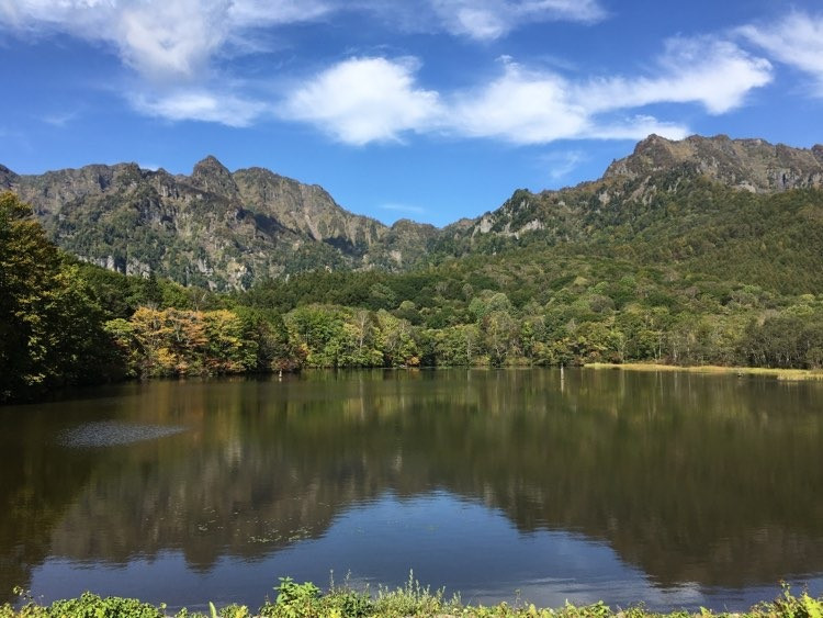 နာမည်တွင်ဖော်ပြသည့်အတိုင်း Kagamiike မှန်ရေကန်သည်တိတ်ဆိတ်သောရေမျက်နှာပြင်ပေါ်တွင်ပတ်ဝန်းကျင်ရှိတောင်များကိုရောင်ပြန်ဟပ်နေသည်။Okusha နတ်ကွန်းမှ ၁၅ မိနစ်ခန့်ကားမောင်းလျှင်ရောက်သည်။ ရာသီပေါ် မူတည်၍ မျက်နှာအသွင်အပြင်အမျိုးမျိုးကိုတွေ့ရသော်လည်းဆောင်း ဦး မိုမိဂျိအရွက်များအရောင်းပြောင်းချိန်နှင့်ဆောင်းရာသီတွင်နေထွက်သည့်အချိန်သည်အလွန်လူကြိုက်များကာတစ်နိုင်ငံလုံးမှဓာတ်ပုံဆရာများစွာသည်ထိုရာသီတွင်လာစုဝေးကြသည်။
