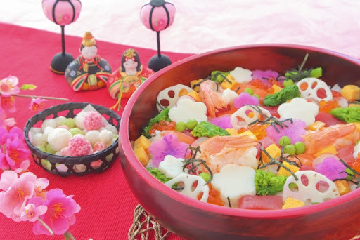 ဟိန ပွဲတော်ရဲ့ အဓိက အစားစာကတော့ Chirashizushi လို့ခေါ်တဲ့ ဆူရှိတမျိုးဖြစ်ပါတယ်။ Chirashizushiကတော့ ရှာလကာရှည်နဲ့နယ်ထားတဲ့ ထမက်းတွေအပေါ်မှာ အရောင်အဆင်းစုံလင်လှတဲ့ အစားစရာတွေကို ပုံပြီးစားလေ့ရှိကြပါတယ်။ ဒီအတိုင်းပုံပြီးစားကြသလို ကိတ်လိုပုံစံလုပ်ပြီးစားကြတဲ့သူတွေလဲရှိကြပါတယ်။ Chirashizushi မှာပါဝင်တဲ့ ပါဝင်ပစ္စည်းတွေမှာလဲ အဓိပ္ပာယ်ကိုယ်စီ ရှိကြပါတယ်။ ဥပမာ ပုဇွန်က ခါးကုန်းတဲ့အထိ အသက်ရှည်ကျန်းမာပါစေ၊ဆိုတဲ့ အဓိပ္ပာယ်ဖြစ်ပြီး ပဲ ကတော့ သေသေချာချာ အလုပ်ကြိုးစားပြီး ကြွယ်ကြွယ်ဝဝ နေနိင်ပါစေ ဆိုတဲ့ အဓိပ္ပာယ်ရှိပါတယ်။