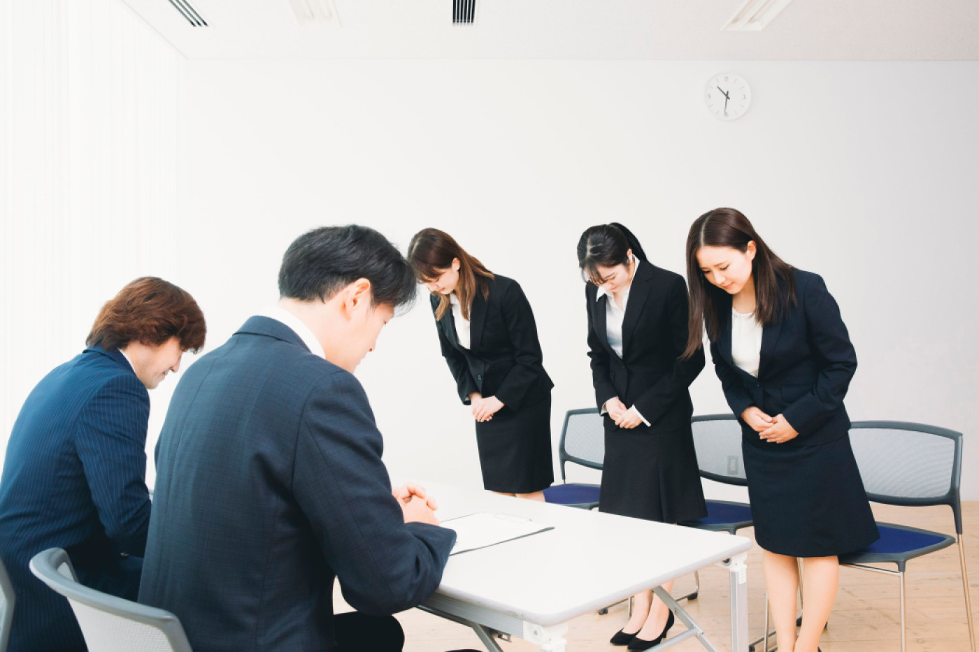 အခန်းထဲ ဝင်တဲ့အချိန် ကျိန်းသေပေါက် တံခါးခေါက်ပါ။ အထဲမှ ဝင်ခဲ့ပါ ဆိုတဲ့ အသံကိုကြားမှ しつれいします。လို့ပြောပြီးမှ ဝင်ပါ၊ အခန်းထဲဝင်တဲ့အချိန်မှာလဲ ချက်ချင်း ခုံပေါ်မထိုင်ပါနဲ့။ အရင်ဆုံး ကိုယ့်နာမည်ကိုကိုပြောပြီးခုံပေါ်မှာ ထိုင်ပါ။