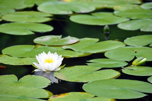 ရေကြာပန်းပွင့်နှင့်အရွက်များသည်ရေမျက်နှာပြင်ပေါ်၌မျောနေသကဲ့သို့ဖြစ်သည်။